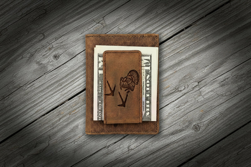 This stylish leather money clip features a unique turkey and track design. It's perfect for keeping your cash and cards organized in a slim and minimalist style.